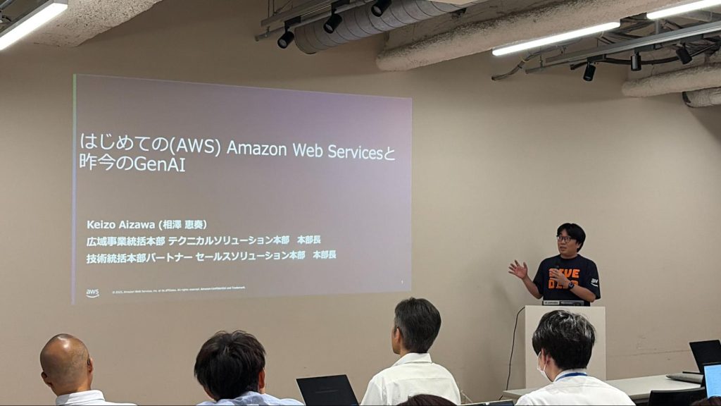 セミナーの基調講演には、アマゾン ウェブ サービス ジャパン合同会社 相澤 恵奏 様をお迎えし、改めてAWSの概要とAmazonのカルチャーを紹介いただきました。AWSを知らない方でもAWSのメリットがよくわかりました。加えて、生成AIに関するAWSのサービスについてもご紹介いただき最新の動向が掴める内容でした。