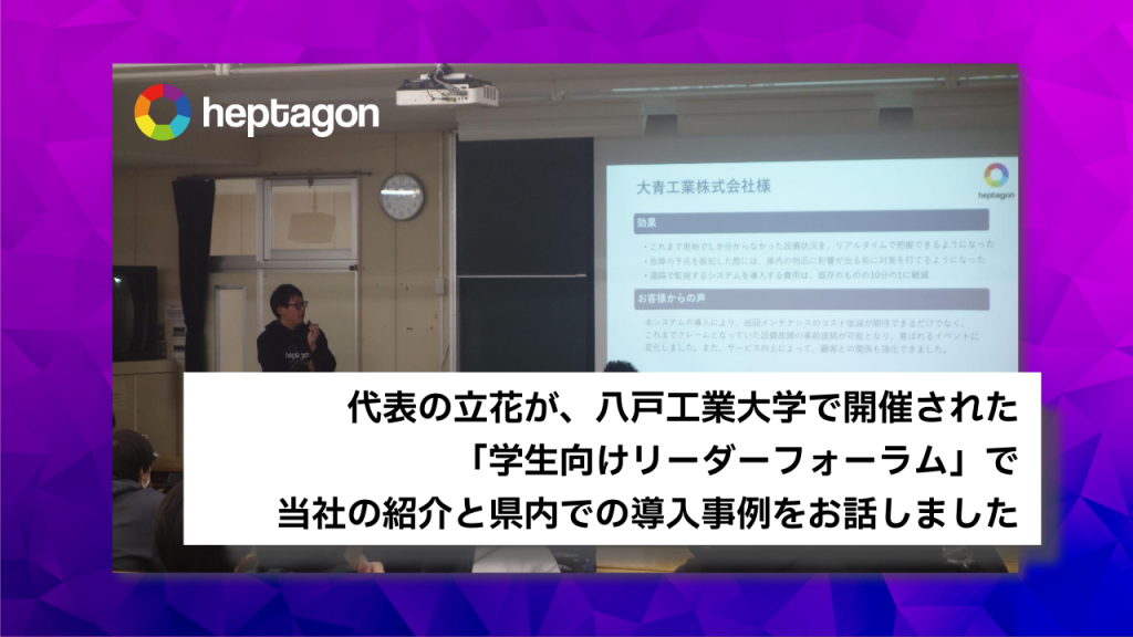 当日は、約50名の学生にご参加いただき、ヘプタゴンの起業の経緯や沿革、青森県内企業と取り組んでいるICTやAIを活用した事例をご紹介しました。学生から「プロジェクトを進める上で工夫したところは何か?」という質問に対して、立花は「お客様と近い距離間でコミュニケーションをとりながら仕事を進めることが地方でのプロジェクトをうまく進めるポイント」などと答えるなど、多くの意見を交わしました。