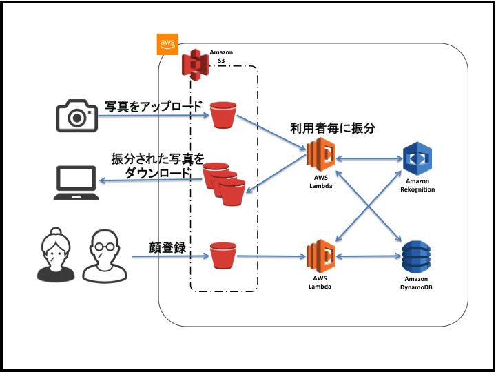 そこで、Amazon RekognitionとAWS Lambdaを利用した、写真判別システムを弊社で開発、導入しました。デイサービス利用者様の顔を事前に登録しておくことで、S3に撮りためた写真をアップロードするだけで、写真に写っている人を特定し、利用者様ごとに写真を振り分けを行います。